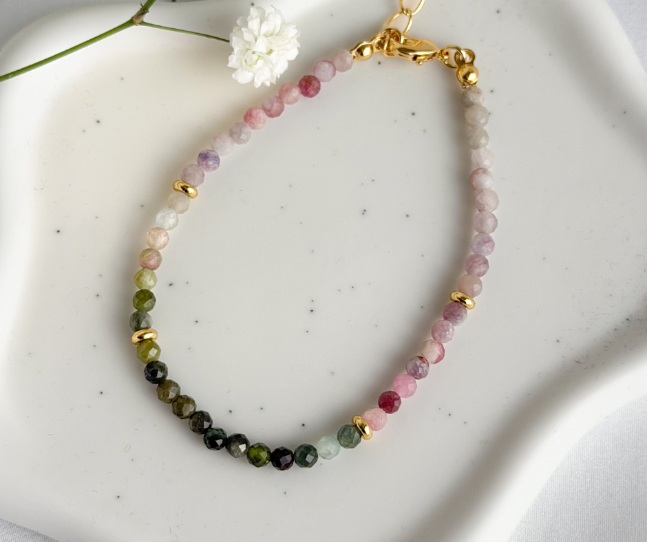 Zanurz się w magii naturalnych kamieni z naszą bransoletką wykonaną ręcznie z kolorowego turmalinu.