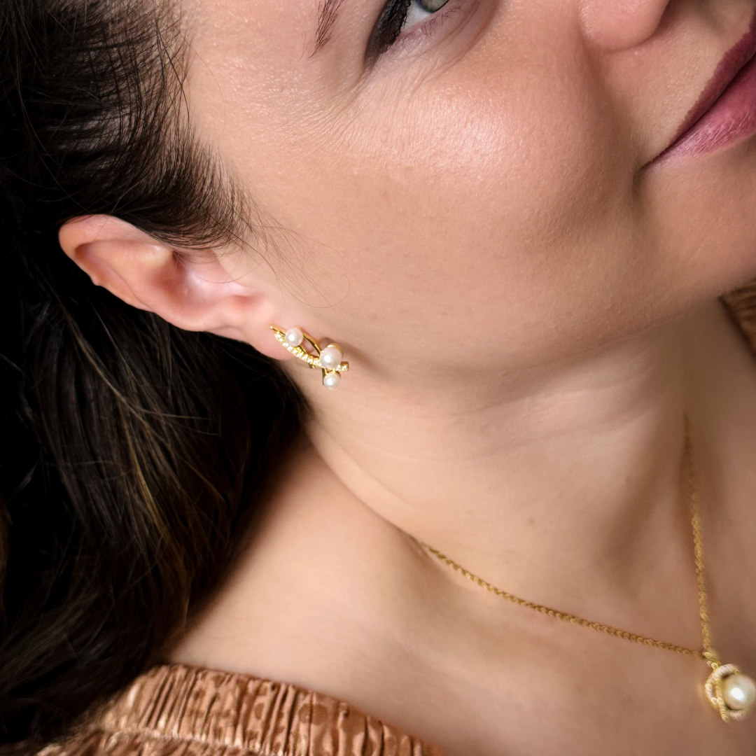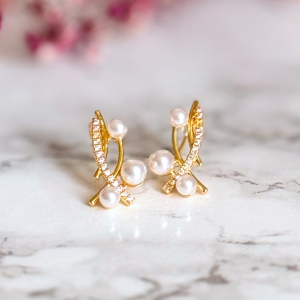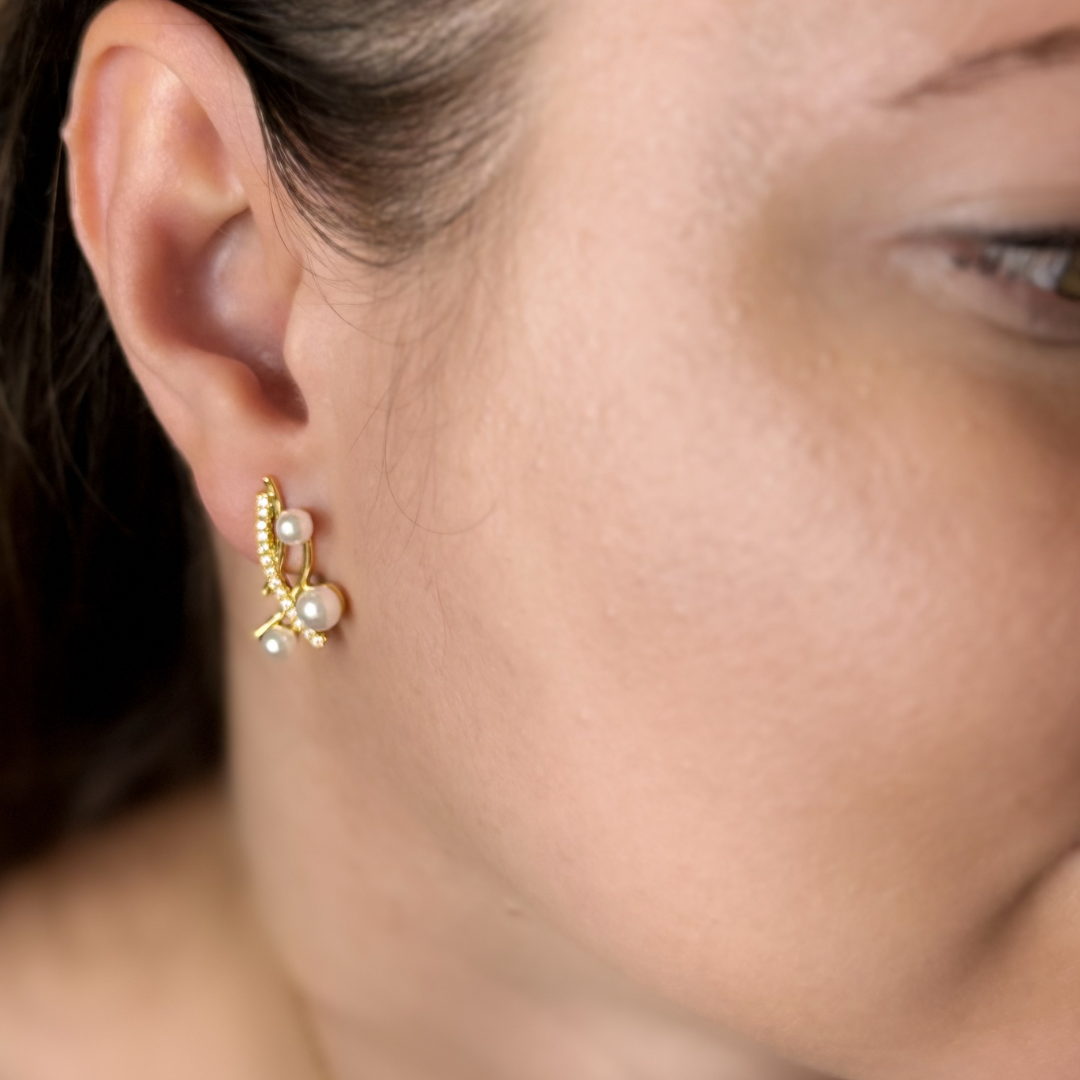 Kolczyki wykonane ze stali szlachetnej certyfikowanej, bez dodatku niklu, ołowiu czy chromu. Pozłacany 18-karatowym złotem. Z wtłoczonymi drobnymi perełkami słodkowodnymi i cyrkoniami.