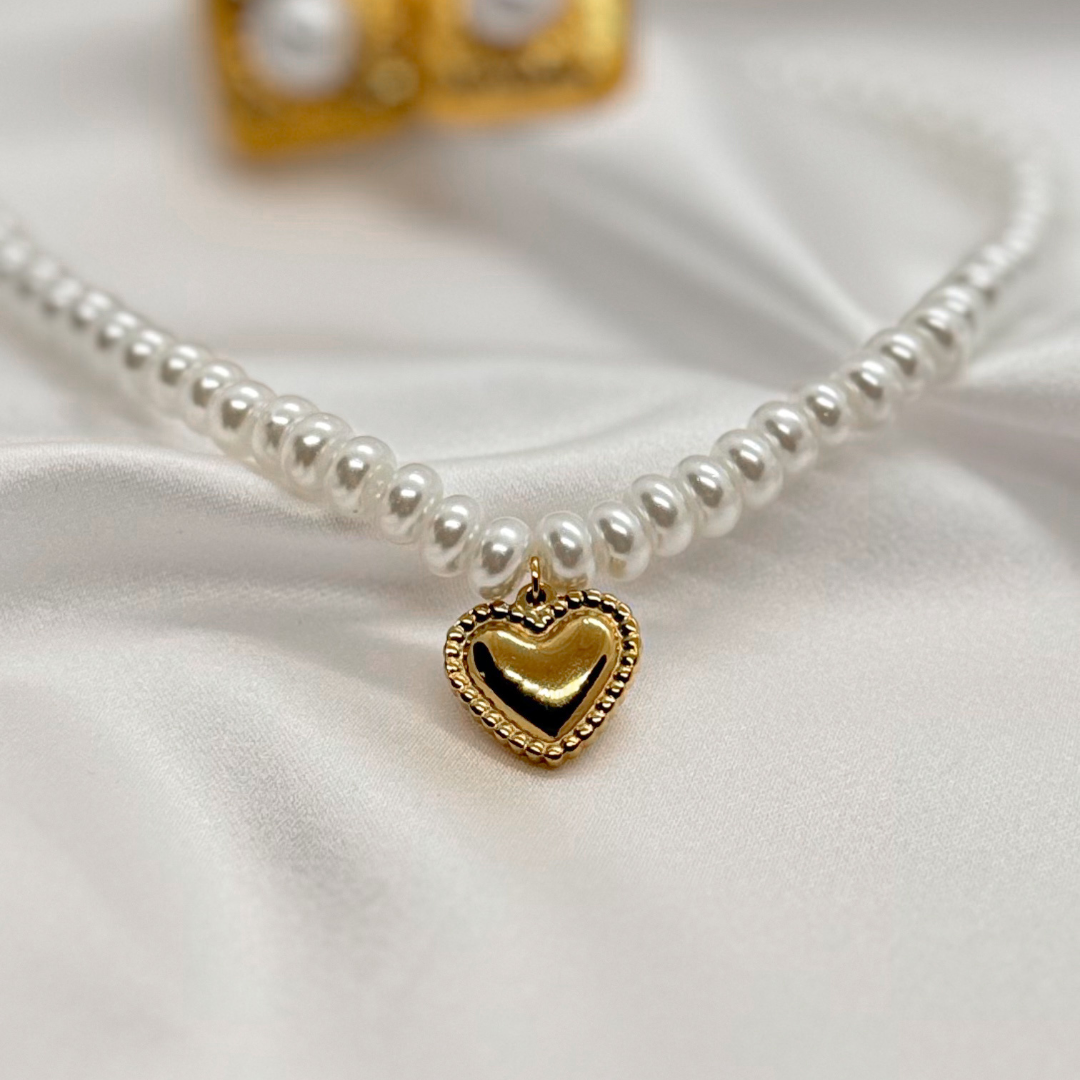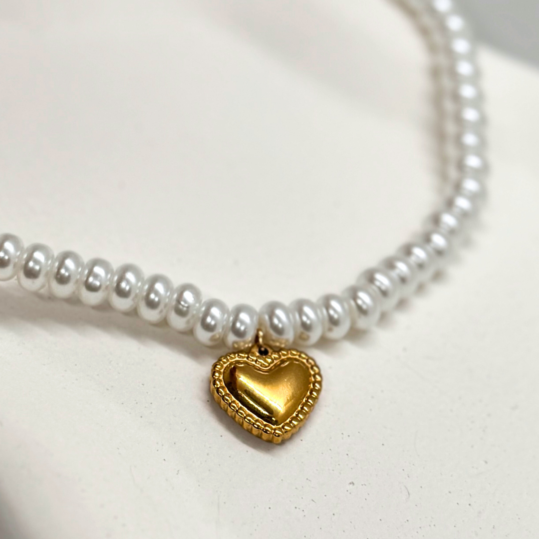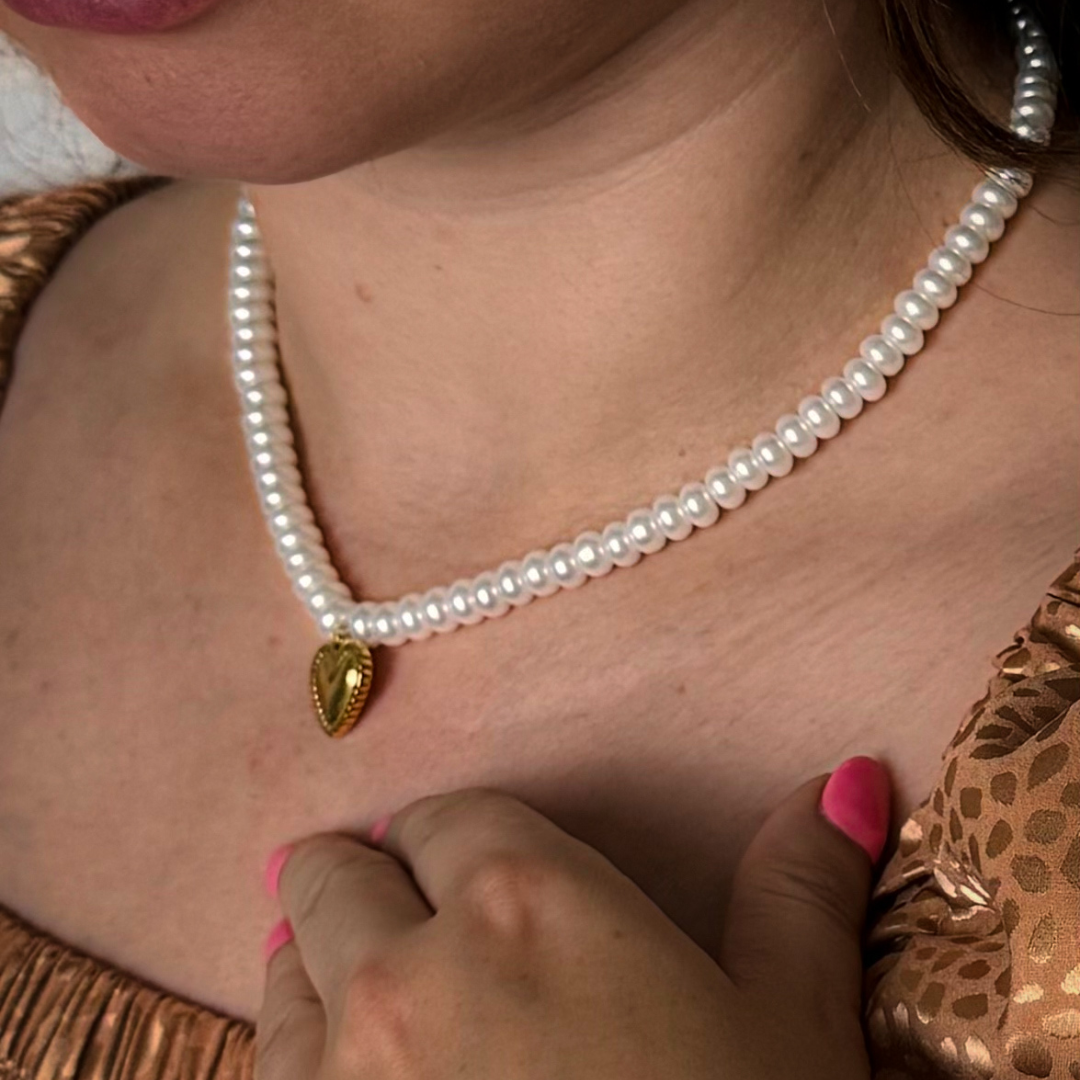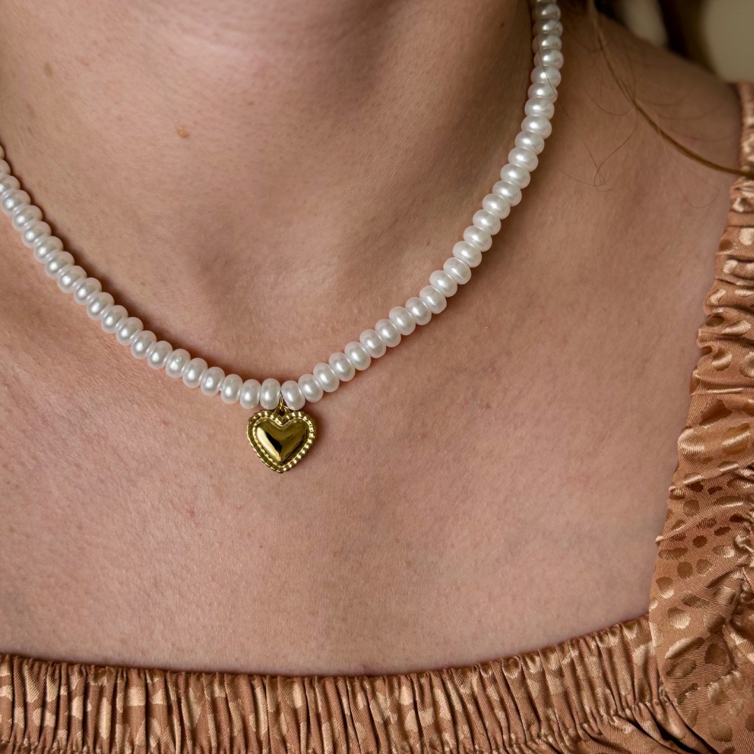 Naszyjnik z pereł wykonany jest z pereł hodowlanych odpornych na zarysowania wraz z zawieszką serduszka wykonanej ze stali szlachetnej certyfikowanej, bez dodatku niklu, ołowiu czy chromu.