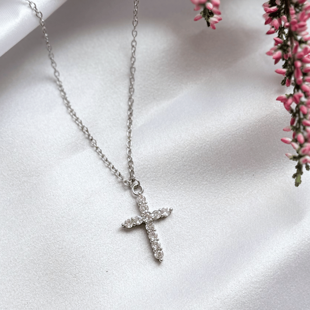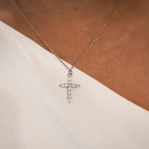Naszyjnik z zawieszką w kształcie krzyżyka w kolorze srebrnym, ozdobiony cyrkoniami to elegancki i wyrafinowany dodatek, który idealnie łączy w sobie klasyczną symbolikę z nowoczesnym designem.