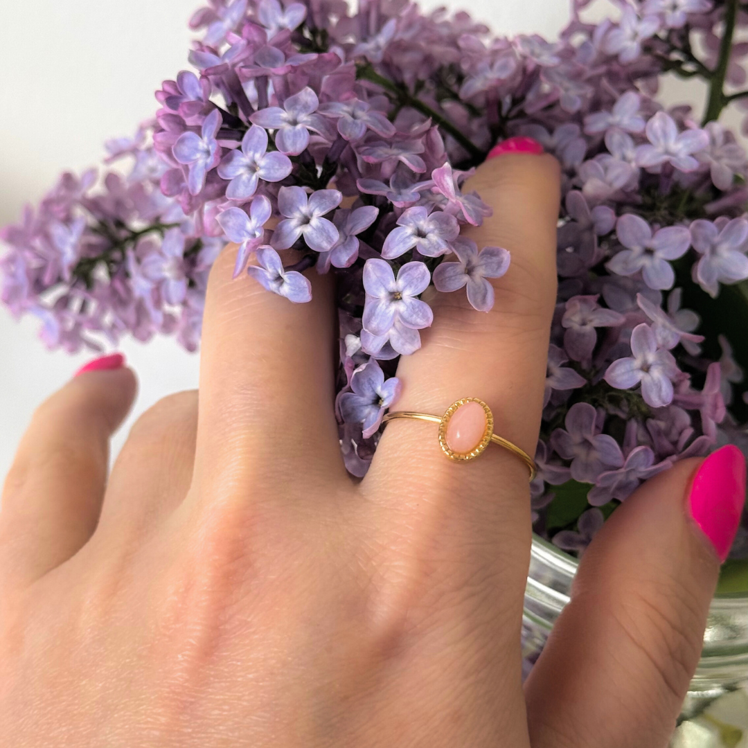 Dzięki pokryciu 18-karatowym złotem metodą platerowania, pierścionek lśni szlachetnym, ciepłym kolorem przypominającym prawdziwe złoto. Kwarc różowy – kamień miłości i harmonii – dodaje mu wyjątkowego charakteru.