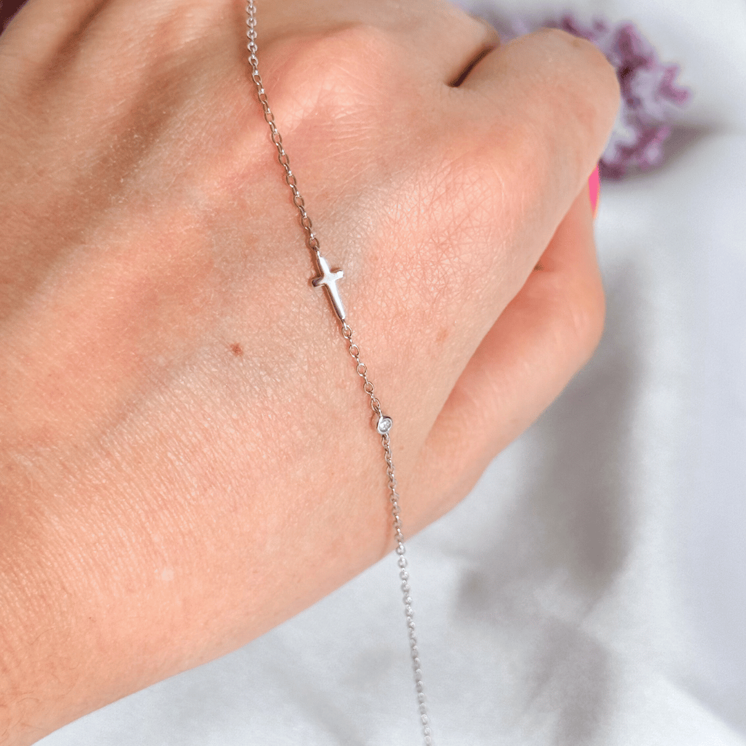 Delikatna srebrna bransoletka z krzyżykiem i oczkiem.
